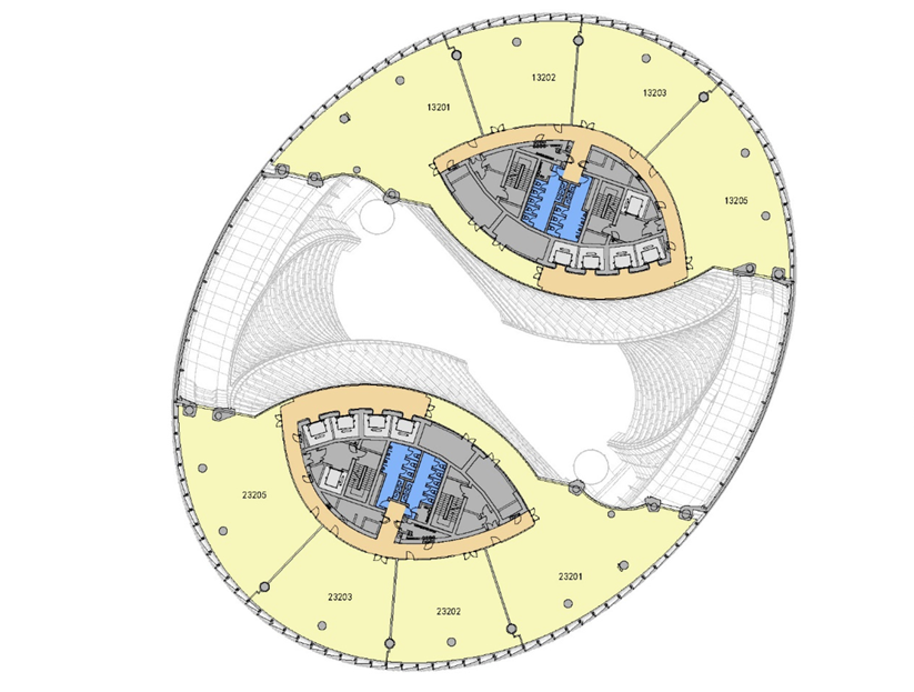 麗澤SOHO由兩個反對稱復雜雙塔借助跨度9m-35m的弧形鋼連橋連接組成,異形中庭變曲率上升高度達200米,為世界之最。鋼結構用量達1.83萬噸,相當于2.5個埃菲爾鐵塔